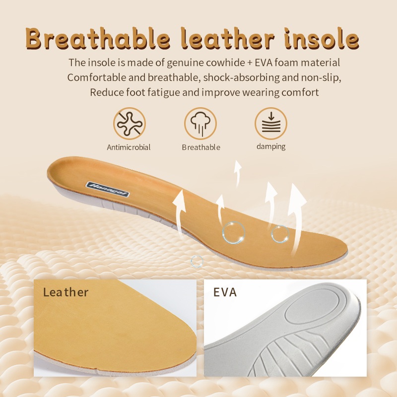 جلد البقر الأصلي + نعل داخلي من إسفنج EVA - مسامي، ممتص للصدمات، وغير قابل للانزلاق. يحافظ على شعور القدمين بالانتعاش ميلاً بعد ميل.