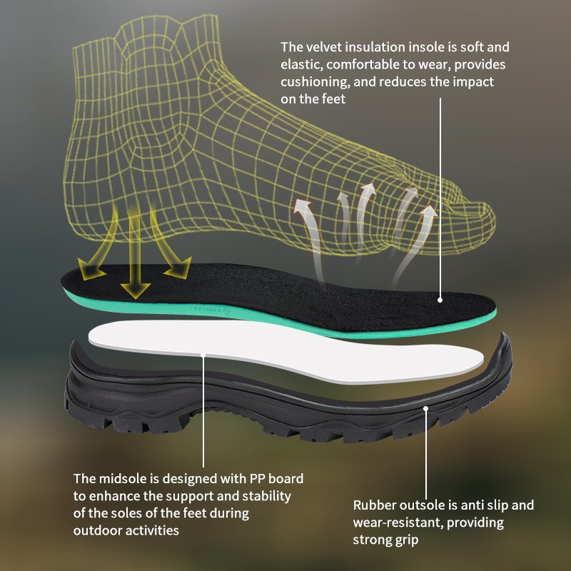 ①بطانة مخملية. ناعمة تحت الأقدام. يمتص التأثير. ②نعل أوسط PP لدعم مستقر. ③نعل خارجي مطاطي لا يتركه. المقابض، تدوم، تبقى موثوقة.
